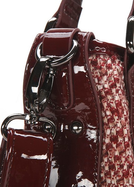 Вместительная и объемная сумка, созданная из плотной ткани, украшена многочисленными вставками из лакированной ткани.
