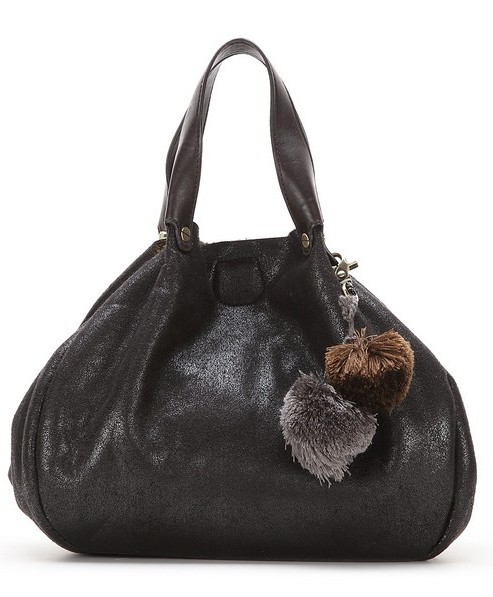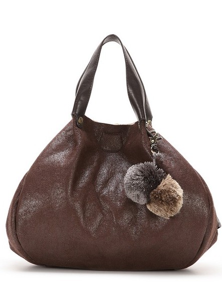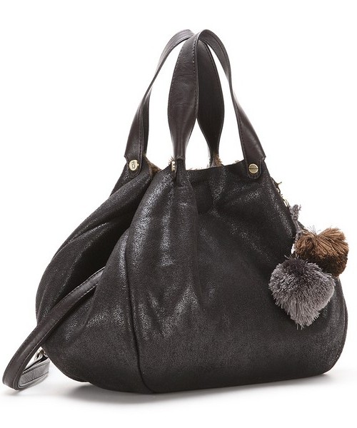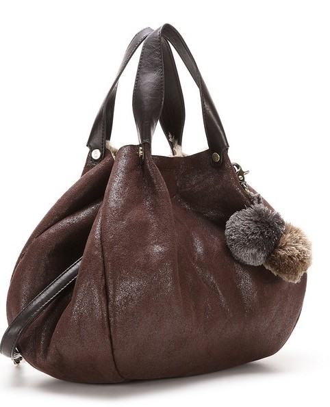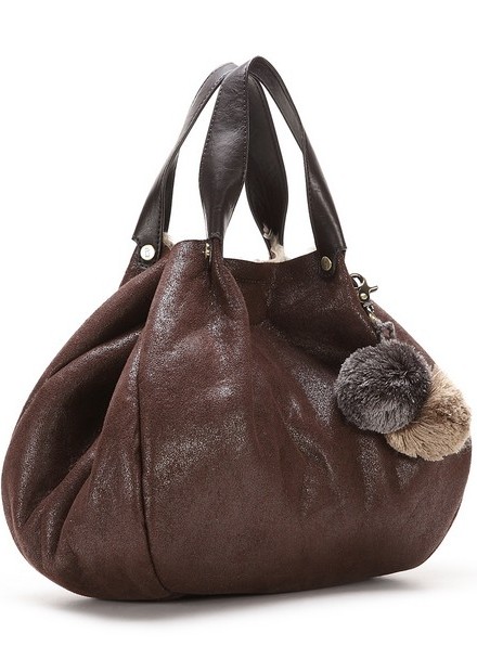 Два меховых бомбончика позволяют затянуть сумку с помощью двух шнурков, которые пронизываю её верхнюю часть. Сумка выглядит стильно и молодёжно.