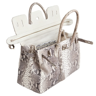 Сумка выполнена из высококачественной кожи питона и шкуры коровы. Все молнии и фурнитура сделаны из металла, а внутренняя подкладка из свиной кожи. В сумке два отделения и несколько дополнительных кармашков для телефона, кредиток и документов. Размер сумки формата А4.