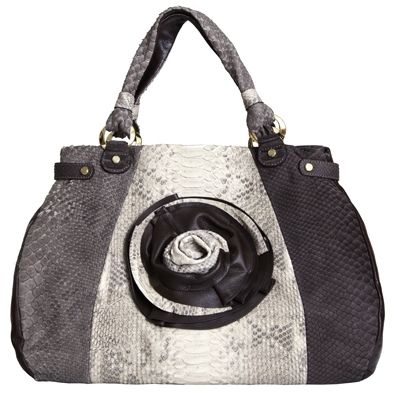 Предлагаем Вашему вниманию сумку классической формы, внешняя часть которой выполнена из кожи питона коричневого оттенка, декорированную цветком-украшением. Вам также понравятся интересная форма и удобные ручки.