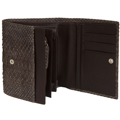 Этот замечательный темно-коричневый кошелек станет удачным дополнением Вашего стильного образа и превратит ежедневную рутину в приятный и элегантный ритуал. Высококачественная металлическая фурнитура и фактура кожи питона идеально подчеркивают классический дизайн кошелька.
