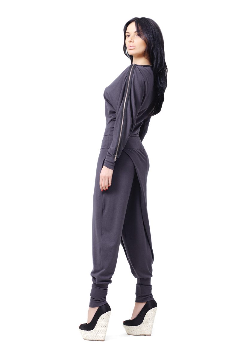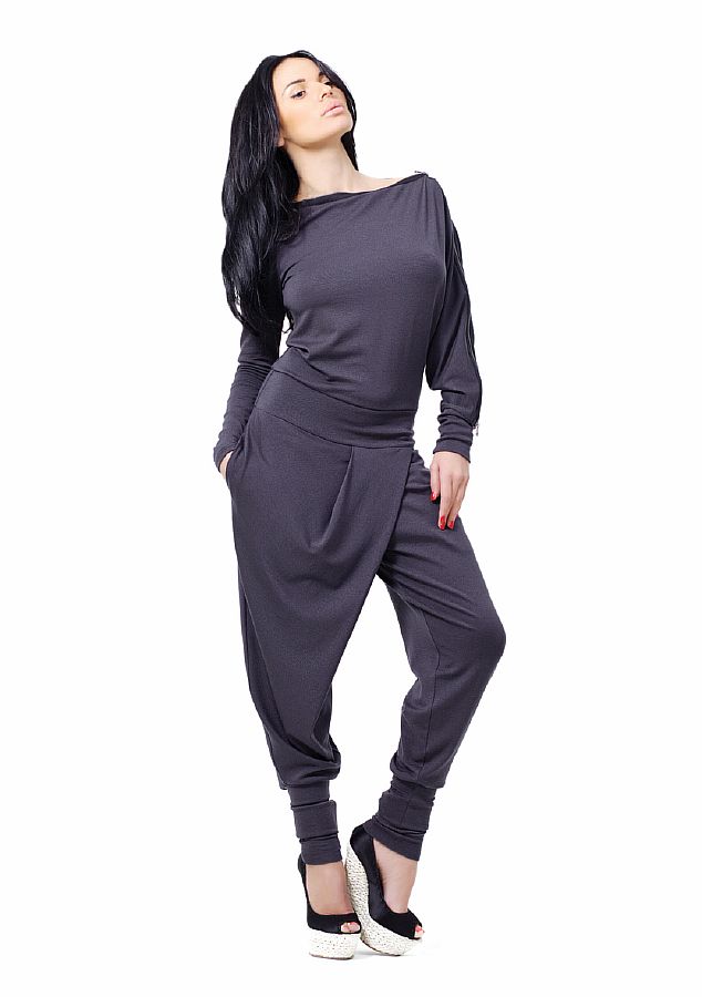 Брюки – свободные сверху, с большим запахом. У основания – сильно заужены, плотно прилегают к щиколотке. В этом наряде вы всегда будете привлекать внимание прохожих, и выделяться из толпы. Самый модный комбинезон сезона!