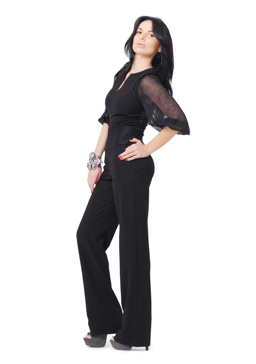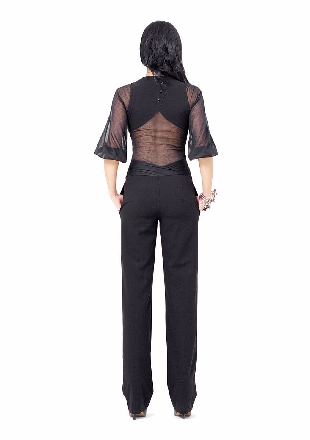 Уникальной особенностью этой модели является верх. Основная часть блузки выполнена из плотной чёрной ткани. Воротник стойка. Застёгивается блуза на чёрную молнию. Рукава – три четверти – прозрачные, свободные. На спинке имеется крупная вставка из прозрачной ткани. По линии талии проходит широкая вставка из атласной ткани. Необычный и очень красивый комбинезон. В нём вы всегда будете выглядеть представительно и строго.