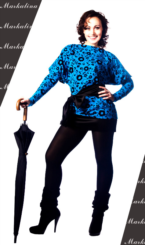 Уникальной особенностью этой модели являются рукава. Верхняя часть имеет форму фонариков, которые резко переходят в прямые облегающие рукава. На талии имеется широкий чёрный пояс из атласной ткани. Снизу блузы проходит такая же чёрная вставка из атласа. Блуза имеет свободный покрой. Вырез горловины – лодочка.