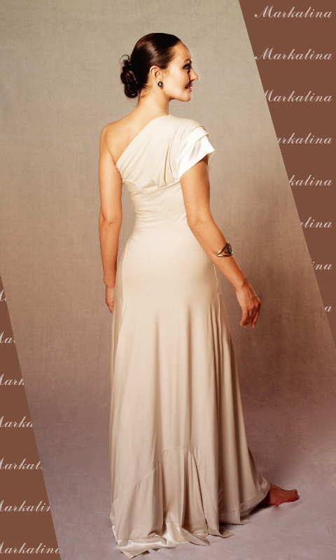 Фасон интересный и необычный – правое плечо открыто, а левое прикрывает небольшой рукав. Верхняя часть платья украшена несколькими крупными вставками ткани. Юбка свободная, длинная – в пол. Благодаря многочисленным волнообразным складкам, этот наряд придаёт вашему образу романтичности и шарма. Подол платья украшен вставкой из широкой атласной ленты. Идеальный вариант для молодых, романтичных и мечтательных особ.