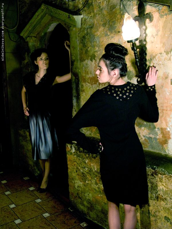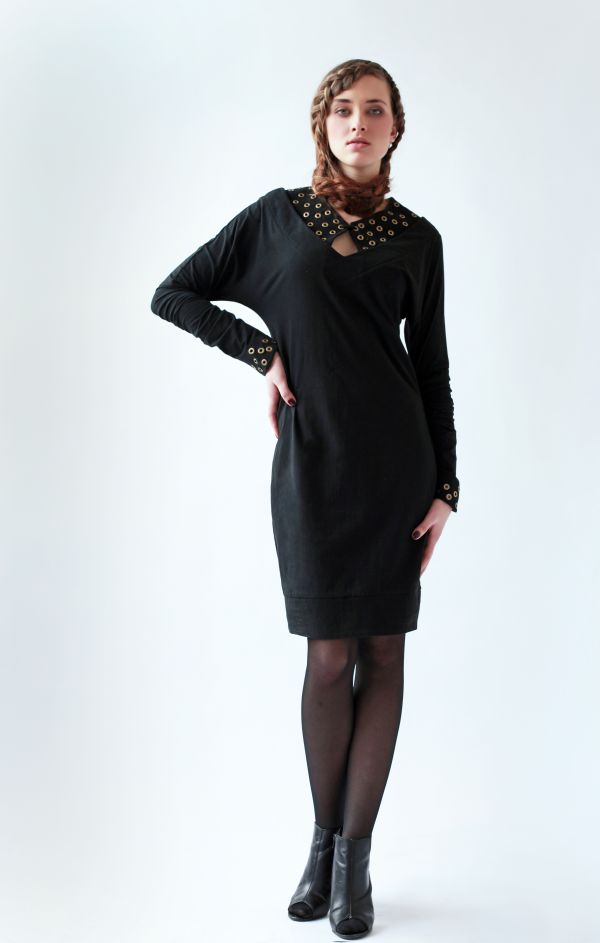 Узкий рукав с широким основанием напоминает покрой «летучая мышь». В дополнение к стильному воротнику, манжеты также украшены металлическими заклепками. Платье длиной до колен, его прямой силуэт ярко выделяет бедра и грудь, а при движении – талию.