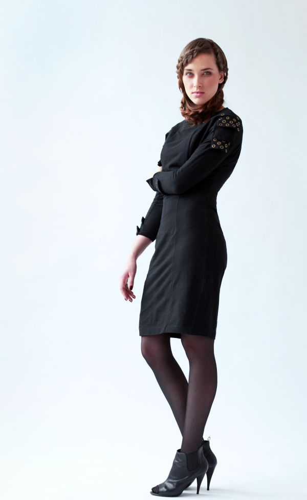 Пусть Вас не вводит в заблуждение закрытая зона декольте, платье прекрасно подчеркивает контуры тела, а вырез лодочкой не будет оттягивать на себя внимание. Узкий укороченный рукав тонко подчеркивает женственность рук. Нашивки с металлическими заклепками в верхней части рукавов делают изгиб плеч плавным, а это визуально уменьшает их ширину и добавляет образу индивидуальности.