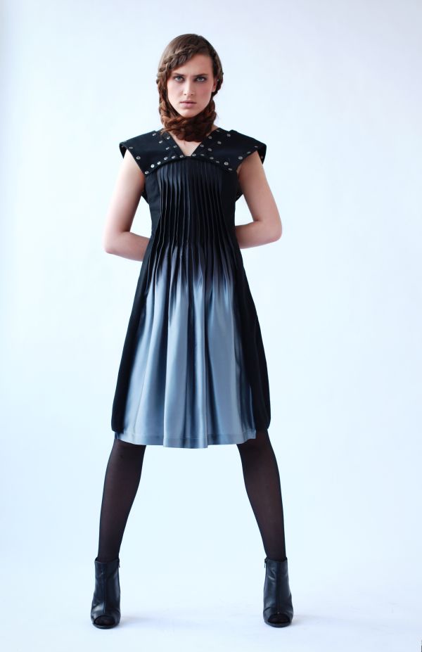 На плечах широкие бретели из четырех деталей украшены металлическими заклепками, они выглядят очень жесткими, что создает интересную композицию вместе с нежным шелком, вызывая в памяти немного брутальные, но всегда романтичные средневековые образы.