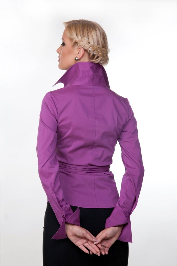 Рукава длинные, прямые, у основания украшены высокими манжетами. Воротник – стойка. Блуза застёгивается на несколько мелких пуговиц.