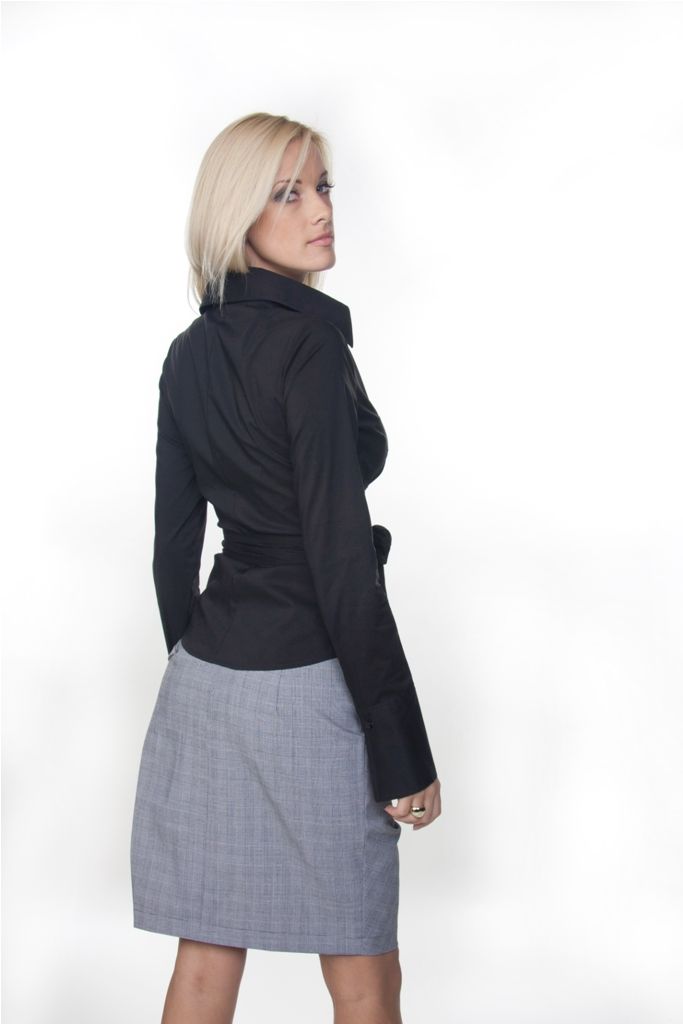 Рукава длинные, прямые, у основания украшены высокими манжетами. Воротник – стойка. Блуза застёгивается на несколько мелких пуговиц.