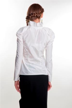 Блуза приталенная, с длинными рукавами, которые у основания украшены небольшими плотными манжетами. В области плеч имеется несколько крупных складок, которые позволяют создать ощущение объёма.