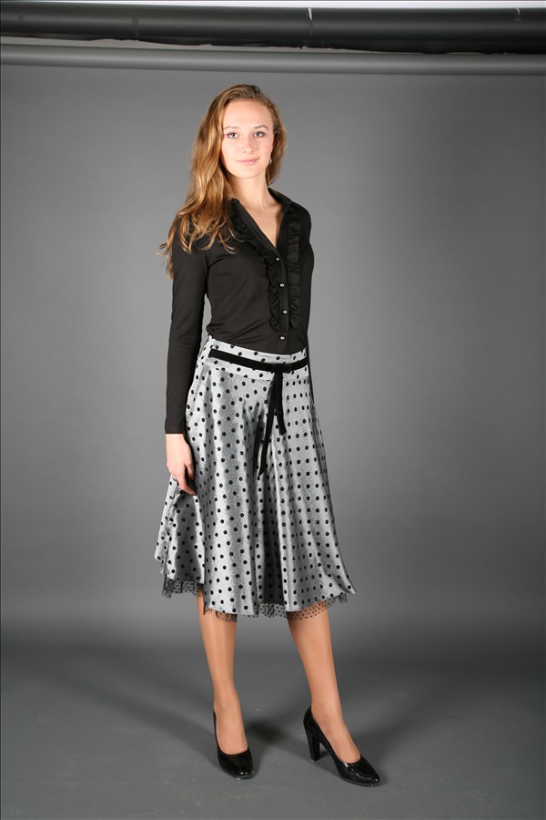 Обратите внимание на интересную дизайнерскую мысль - тонкая сеточка исполняет роль нижней юбки. Этот элемент в сочетании с расцветкой «в горошек» придает этой модели некий ретро-шарм. Но глубокие цвета и блестящая ткань ясно напоминают о продуманности стиля и современности дизайна. Тонкий декоративный поясок выделяется на фоне общей материи, что подчеркивает и стройнит талию.