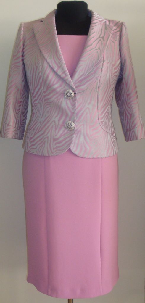 Прямое платье нежного пастельного оттенка создает отличный фон для жакета с рукавами 3/4, глубоким вырезом и большими оригинальными пуговицами. Вертикальные строчки, мягко закругляющиеся на уровне пояса, стройнят и подчеркивают линию талии. Красивый узор материала жакета добавляет динамичности Вашему элегантному и женственному образу.