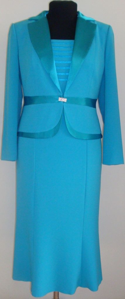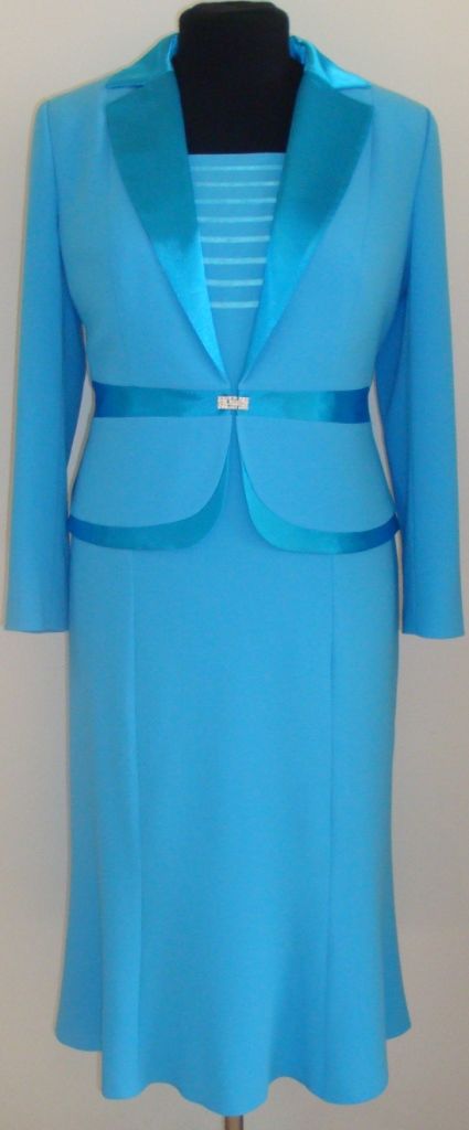 Отделка из атласа, сверкающий зажим на пиджаке, струящаяся юбка годе, которая будет стройнить ваш силуэт - лишь некоторые достоинства данной модели! Благодаря продуманному покрою, длине чуть ниже колен и подбору расцветки, этот костюм отлично подойдет для дам с особо женственными формами.