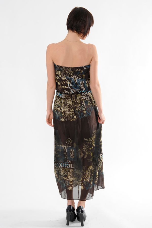Оригинальное платье из полупрозрачной ткани обязательно должно быть в гардеробе настоящей модницы! Открытое декольте без бретелей, макси длина, незамысловатый прямой покрой с резинкой по талии и верху лифа - именно тот фон, на котором так красиво смотрится "буквенный" яркий принт, привлекая внимание и побуждая желания "прочитать" хозяйку этого платья. А вот степень открытости для такого чтения определять Вам!