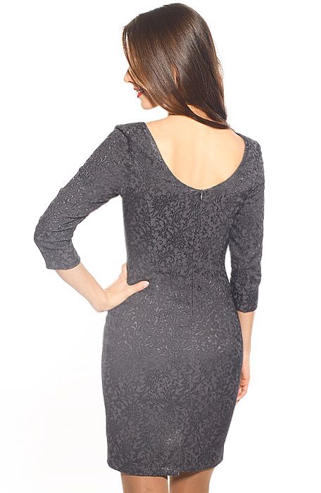 Элегантное вечернее платье-фуляр. Модель выполнена из темно-серого стрейч-жаккарда с узорчатым набивным рисунком. Небольшие рельефы спереди и сзади плавно переходящие в вытачки визуально стройнят и отлично подчеркивают фигуру. Потайная молния застегивающаяся до линии талии расположена по шву спинки, который заканчивается небольшой шлицей. Длина рукава – три четверти. Оригинальная горловина выполнена спереди в форме лодочки, а сзади – глубокий вырез до линии застежки бюстгалтера, тем не менее не открывая его. Низ платья отстрочен широкой отделочной строчкой.