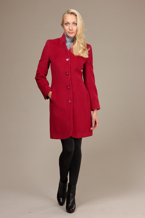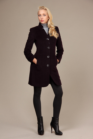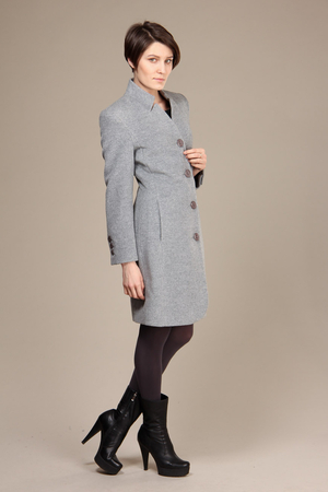 Пальто отличается своим необычным покроем и фасоном. Застёгивается на несколько крупных пуговиц. Воротник – небольшая стойка. Маленький V-образный вырез позволит продемонстрировать отличный шарф.