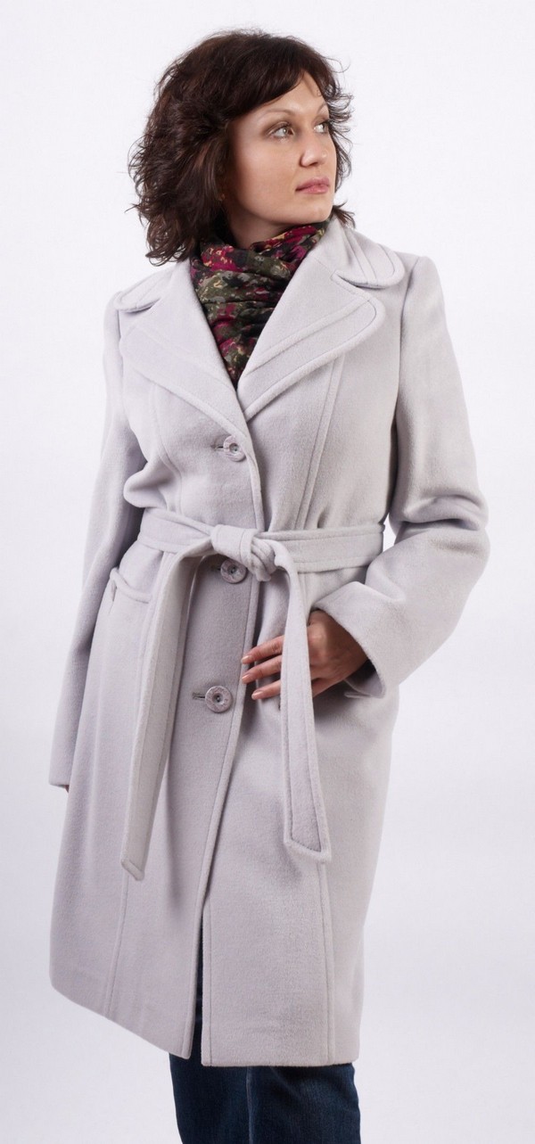 Пальто имеет красивый фасон, благодаря чему, привлекает взгляды прохожих. Длина модели – чуть выше линии колен. Воротник широкий, угловой. Застёгивается пальто на несколько крупных пуговиц. Большой V-образный вырез позволяет продемонстрировать дорогой и стильный шарф.