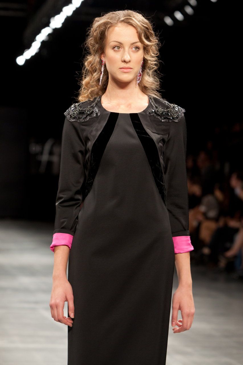 Длина платья – до линии колен. Рукава – три четверти. У основания имеются ярко-розовые манжеты, придающие этому наряду пикантности. Верхняя часть платья украшена погонами , вышитыми из бисера.