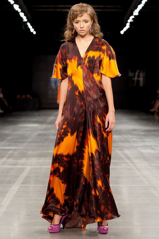Свободное, слегка приталенное платье из шелковой ткани. Длина изделия – до пола, однако по спинке имеется небольшой шлейф. Полочка выполнена из двух половинок, а за счет яркого рисунка на ткани это визуально делит модель на несколько частей. Рукав длиной до локтя, выполнен в виде «крылышек» и не стесняет движений. По линии груди идут косые подрезы. Треугольный вырез горловины дополняет легкость изделия. За счет свободного покроя и шелковой ткани создается эффект воздушного скольжения. Благодаря яркой расцветке ткани модель притягивает взоры как пламя костра.