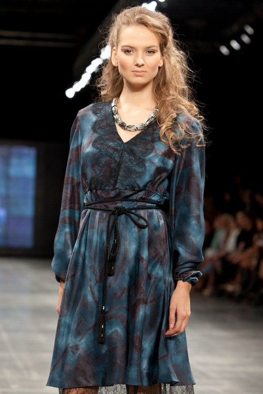 Свободное нарядное платье выполненное из 100% шелка синего мраморного цвета. Рукав длинный, слегка присобранный сверху по окату и собранный на резинку по линии манжета. Вырез горловины – треугольный. По краю настрочена широкая кружевная лента. Полочка выполнена из двух частей с подрезом под линией груди. Талия слегка завышена. Юбка в данной модели расклешенная и дополнена кружевной нижней юбкой. Нижний край юбки обработан швом «зиг-заг». По линии талии платье подвязывается черным шнуром с элегантными кисточками. Длина модели – выше колен.