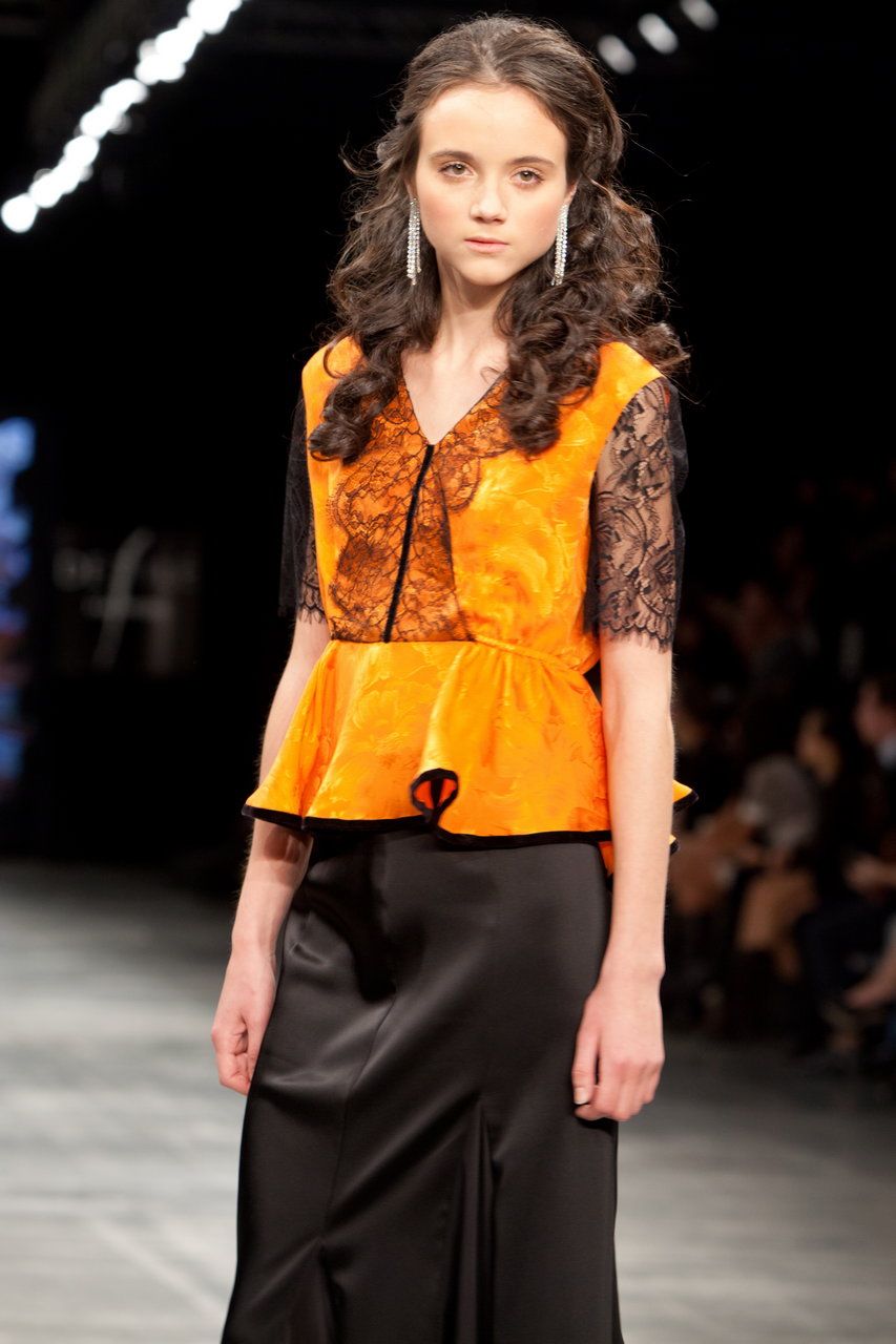 Яркая и утонченная нарядная блуза, отличающаяся креативным покроем и сочетанием тканей. Выполненная из 100% шелка яркой расцветки, эта модель создает легкий и непринужденный образ. Данная модель является отрезной по линии талии с притачной широкой баской. По нижнему срезу баска обработана косой бейкой из черного шелка. По верхнему краю баска присобрана на узкую резинку для более плотного прилягания изделия. Вырез горловины треугольный. По вырезу и планке настрочена широкая лента из французского кружева. Рукава также выполнены из французского кружева, и длина их доходит до локтя.