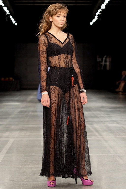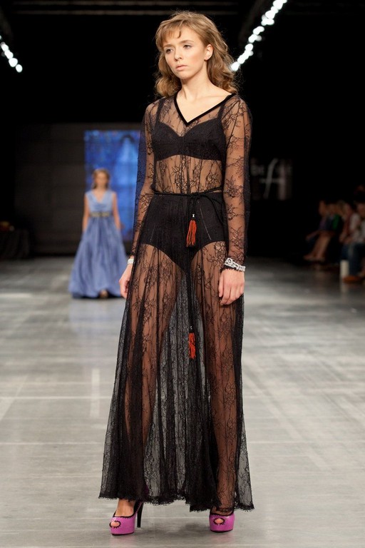Длинное черное кружевное платье свободного покроя. Модель слегка расклешена к низу. По полочке и спинке проходят вертикальные рельефы. Рукава длинные и обработанные по краю кружевной каймой. Также обработан и низ модели. Широкий треугольный вырез горловины обработан узкой атласной лентой. По линии талии завязан шнурок с большими контрастными кисточками. Данная модель идеально подходит как свободная накидка поверх мальенького черного платья-футляра. Она создает эффект воздушной легкости и придает утонченность вашему образу.