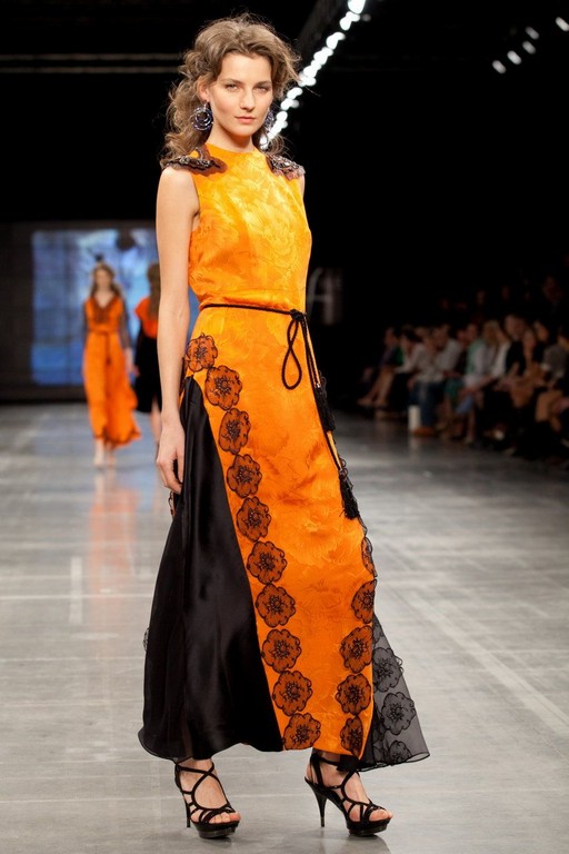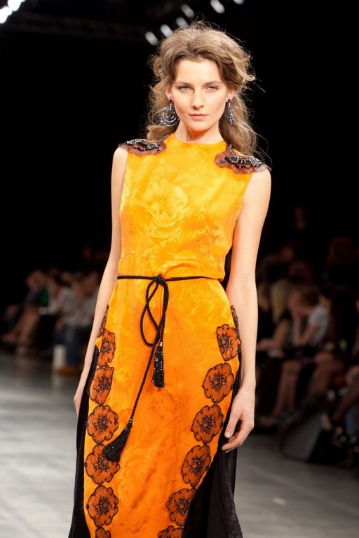 Яркое платье из шелка прилегающего силуета. Вырез горловины круглый и обработан аккуратным швом. Полочка цельнокроенная с небольшими вытачками на груди. Модель отрезная по линии талии, и талия слегка завышена. Спинка состоит из двух частей и застегивается на потайную молнию. Очень оригинально в данной модели выполнена юбка. Она состоит из основной ткани и клиньев, вставленных по бокам. Клинья выполнены из черного шелка и шифона. В обрамлении из шифоновых цветов втачные клинья смотрятся особенно эффектно. Особую изюминку модели придают погоны, расшитые бисером и стразами.