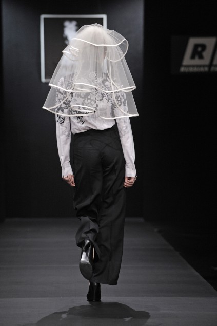 Отличительной особенностью данной модели является наличие не только крупного принта, но и чёрного воротника-стойки, который красиво контрастирует с основным белым цветом изделия. Рукава длинные, манжеты высокие, застёгиваются на запонки.