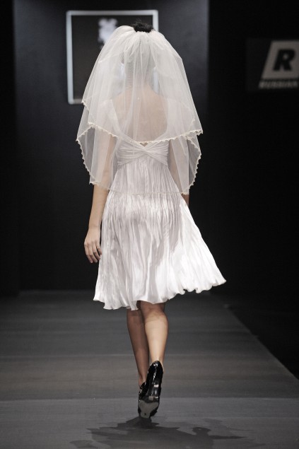 Длина платья – до линии колен. Юбка свободная, украшена многочисленными угловыми складками, благодаря чему, платье смотрится очень необычно и стильно.