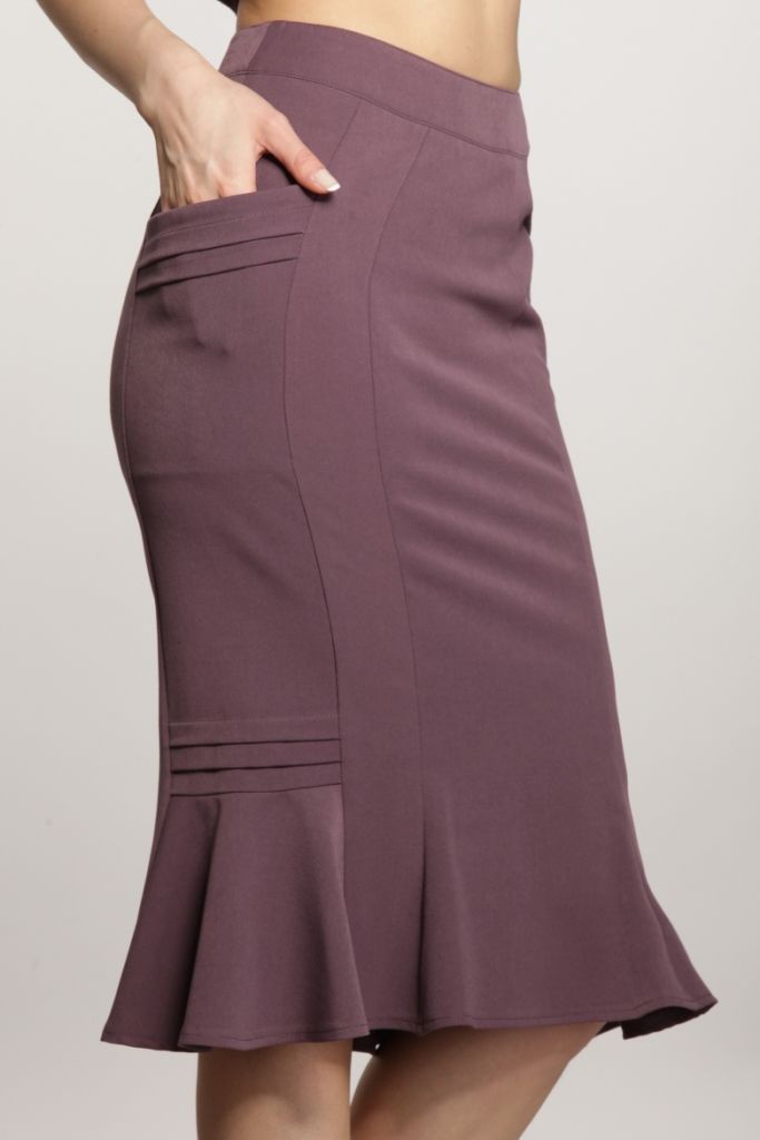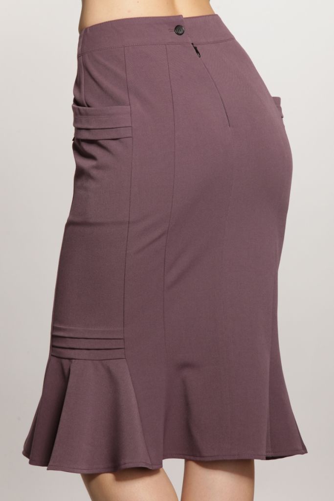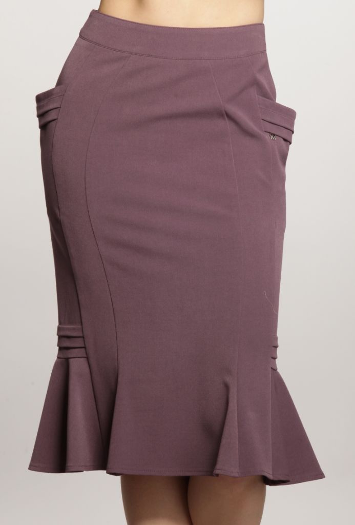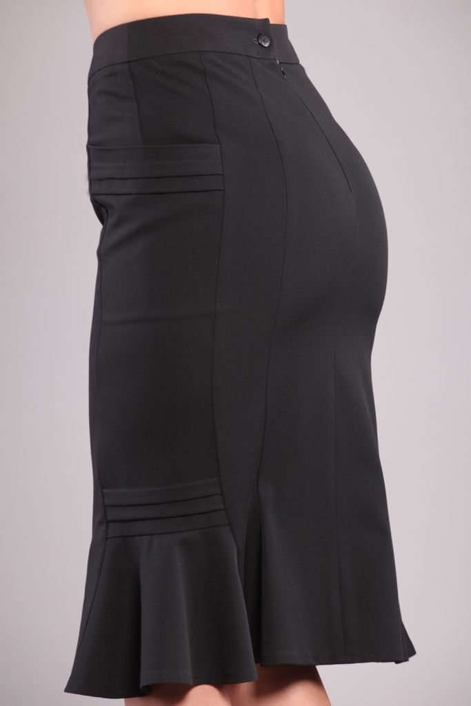 Длина юбки – до линии колен. Верхняя часть юбки прямая, прилегающая, но не сковывающая движений. Подол немного расклешен, благодаря чему, внизу образуются произвольные складки. При ходьбе очень красиво и эффектно смотрятся.