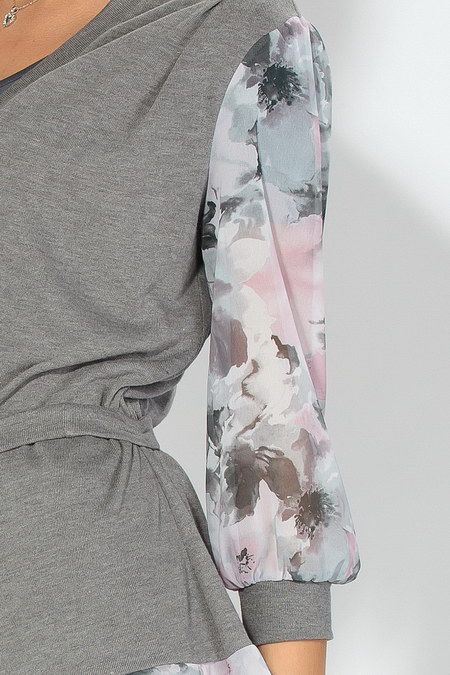 Прекрасная цветовая гамма - элегантный серый оттенок полочек и спинки и нежный розовый принт на рукавах и оторочке. Рукава три четверти, завязывается жакет на узкий длинный поясок, создан из струящейся, приятной к телу ткани.