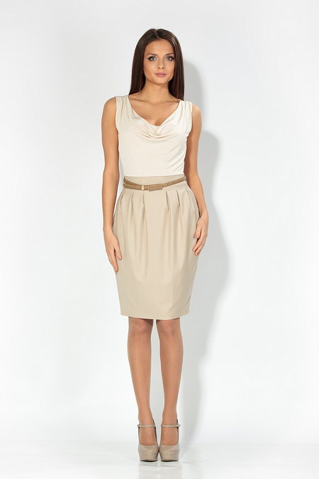 Верх платья изысканный и утонченный – присобранные, струящиеся складки выреза горловины, отсутствие рукавов. Низ платья напоминает нераскрывшийся бутон розы. Тонкий, светлый в тон ремешок завершает Ваш стильный образ. Длина до колена идеальна для серьезных бизнес-леди.