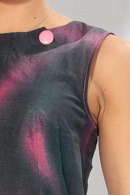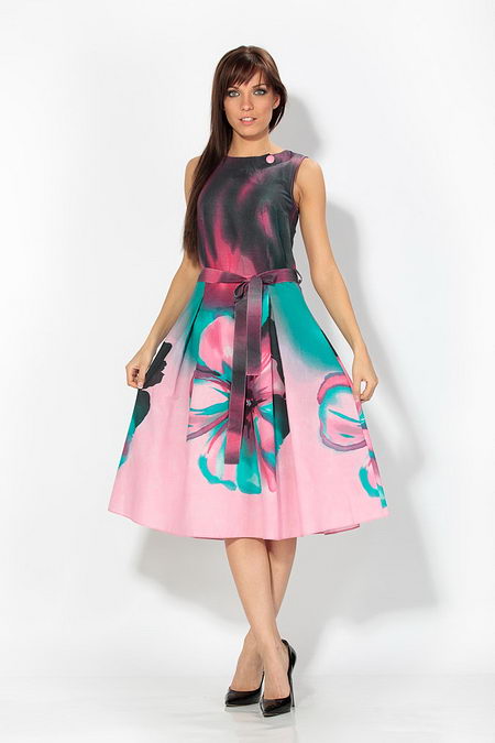 Красивое летнее платье из хлопка непременно порадует истинных поклонниц моды и любительниц комфорта. Простота покроя - юбка колокол под поясок, горловина «лодочка» - дополнены ярким потрясающим принтом: на подоле расцветают большие цветы, а верх платья украшен контрастными разводами. Завершает всю эту феерию маленькая розовая пуговичка – потрясающий ход для полноты образа.
