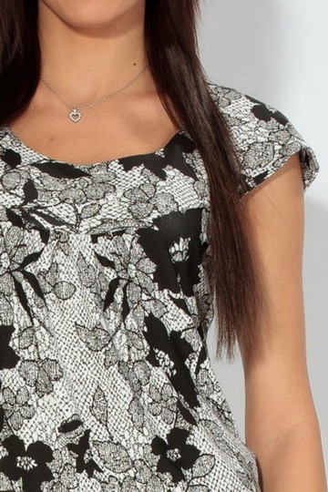 Черный цветочный принт на белом создает впечатление ажура, что придает платью очарование и торжественность. Приятна и солидна длина платья, чуть выше колена. Простой лаконичный силуэт и эластичный материал создают ощущение комфорта, подчеркивают фигуру и прекрасно стройнят.