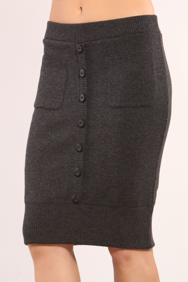 Спереди имеется два небольших кармашка. Посередине, по всему переднему полотнищу проходит ряд из мелких чёрных пуговиц. Пояс так же выполнен в виде плотной резинки, которая позволяет юбке хорошо держаться.