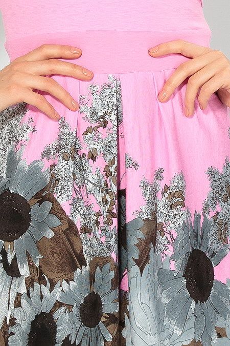 Покрой приталенный с немного расклешенной юбкой, украшенной цветочным принтом в серо-коричневых тонах. Демократичная длина до колен.