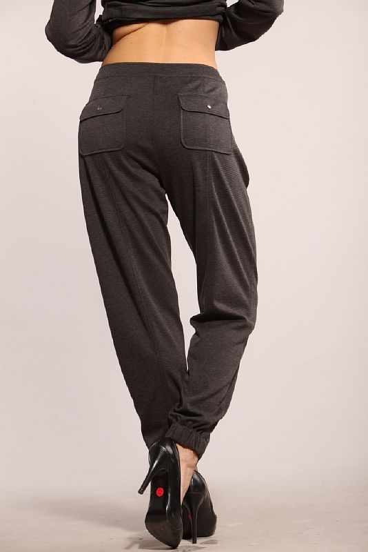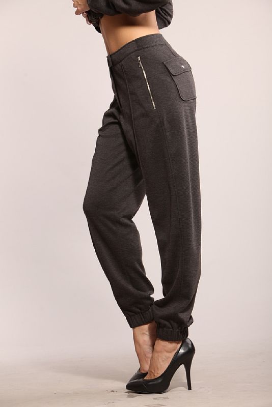 Брюки, выполненные из трикотажного полотна с добавлением шерсти. По задним полотнищам расположены продольные рельефы, отстроченные отделочной строчкой. В верхней части брюк обработаны накладные карманы с клапаном. Клапан застегивается на кнопку. По передним половинкам по центру отстрочена декоративная стрелка. В боковых швах расположены карманы, застегивающиеся на металлическую молнию. Брюки посажены на пояс, который застегивается на кнопку. Спереди брюки застегиваются на молнию, отсроченную отделочной строчкой. Длина модели – до щиколоток. Нижний край брюк присобран на широкую резинку.