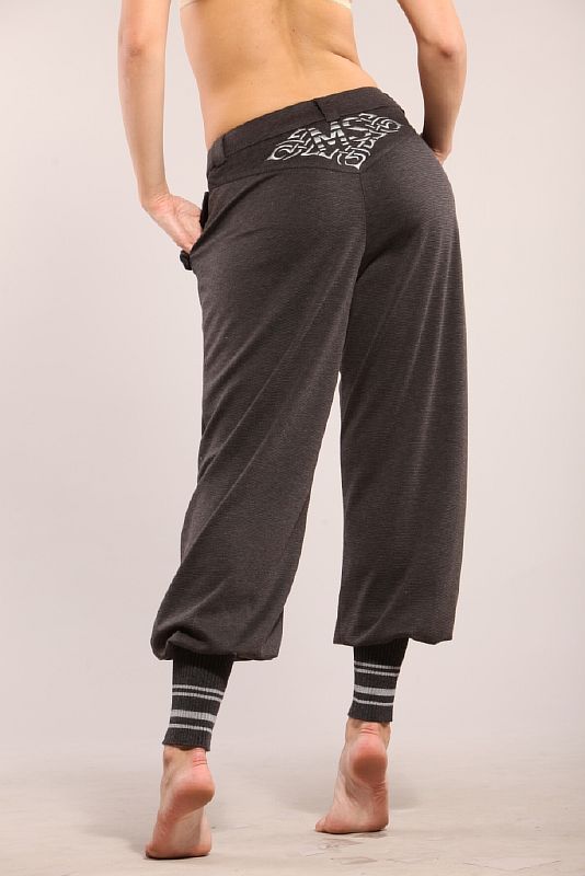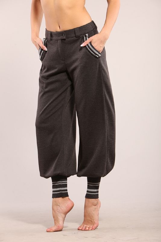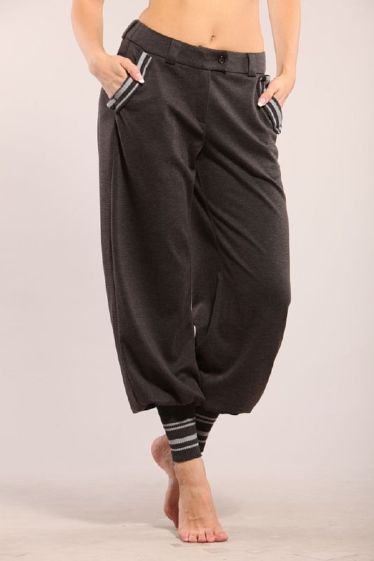 Свободные брюки-шаровары, выполненные из мягко облегающей ткани. Высота модели – на бедра. На задних половинках расположена фигурная кокетка, отстроченная отделочной строчкой. Кокетка украшена вышивкой. По передним половинкам расположены косые карманы. Край кармана декорирован контрастной лентой в полоску. Брюки застегиваются на молнию, отсроченную одной отделочной строчкой. Модель посажена на пояс с пятью шлевками и застегивается на прорезную петлю и пуговицу. Низ модели обработан широкими плотно прилегающими манжетами в цвет декору кармана.