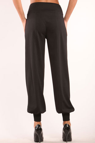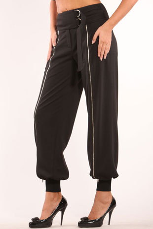 Черные трикотажные брюки свободного покроя. По центру передних половинок по всей длине брюк встрочена молния из металла. По задним половинкам расположены два продольных рельефа отстроченных отделочной строчкой. Брюки застегиваются на молнию, отстроченную одной отделочной строчкой. Модель посажена на широкий пояс, плотно облегающий фигуру. Пояс в свою очередь декорирован еще одним настрочным поясом, который застегивается на два полукольца и ленты. Карманы в данной модели отсутствуют. По низу брюк расположены широкие манжеты из основной ткани, которые плотно прилегают к ноге.
