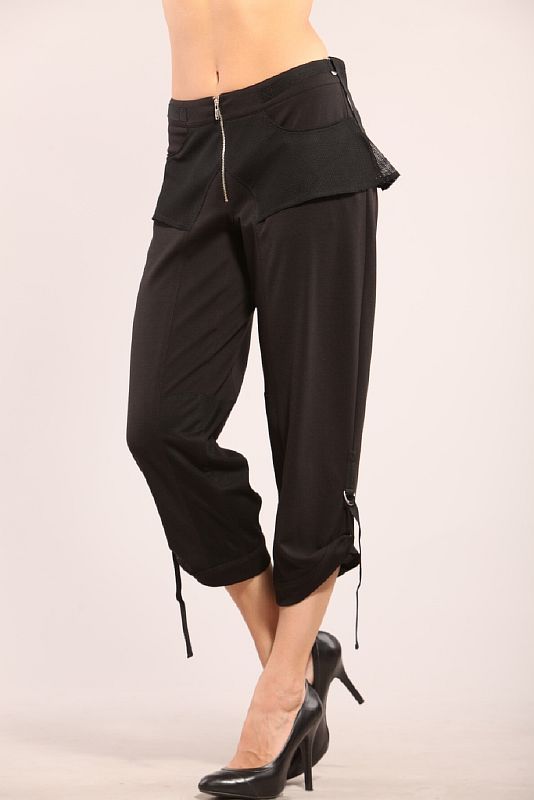 По передним и задним половинкам проходят продольные рельефы, отстроченные одной отделочной строчкой. Брюки застегиваются на открытую металлическую молнию. Модель посажена на пояс. По поясу настрочены узкие атласные ленты черного цвета, которые застегиваются на два полукольца по боковым швам. Край атласной ленты свободно свисает. Вокруг всей модели в районе бедер настрочена фигурная декоративная деталь из сеточки. По низу модели проходит широкая отделочная строчка. По боковому шву также пристрочена атласная ленточка с полукольцами. Второй край пристрочен изнутри и застегивается на полукольца снаружи.