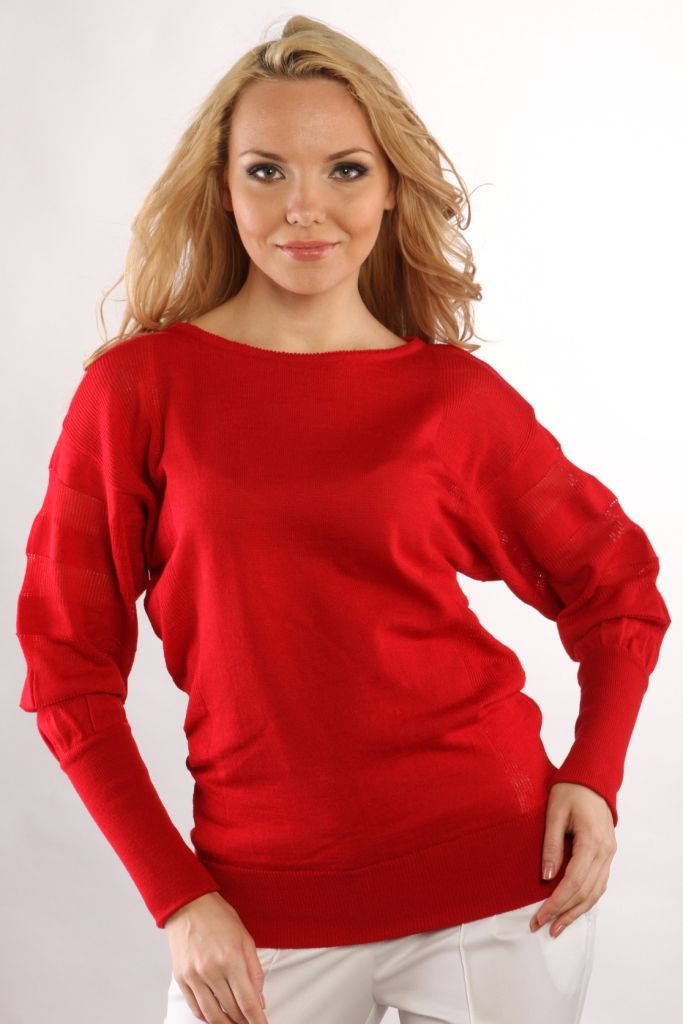 Тонкий весенний джемпер из вязаного полотна. Вырез горловины круглый, широкий, обработанный узкой вязаной полосой. Линия плеча приспущена. Длина модели – до середины бедра. Модель посажена на широкий пояс в виде резинки. Пройма углубленная, в нее втачен широкий рукав, который плавно сужается к манжету. Манжет длинный, выполненный из вязаной резинки и отстроченный по обоим краям узкой отделочной строчкой. На рукавах выполнен узор в виде горизонтальных широких полос разной плотности. Центральная часть полочки выполнена вязкой без узора. Модель удачно сочетается как с брюками, так и с юбкой.