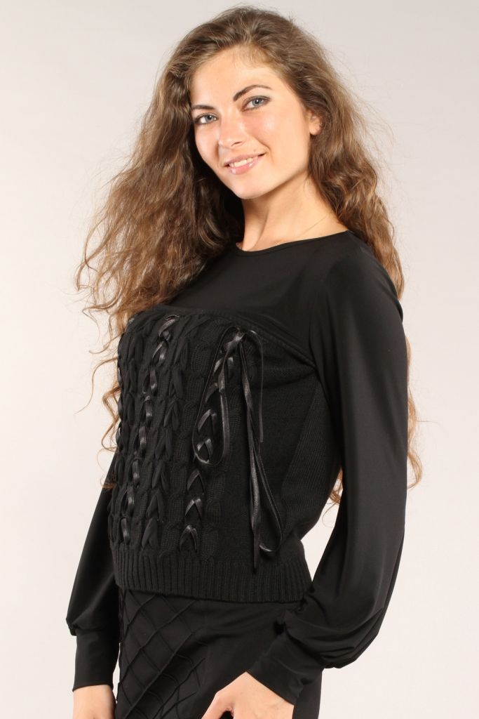 Нарядный комбинированный джемпер черного цвета с лентами. Верхняя часть модели выполнена из тонкого трикотажного полотна. Вырез горловины «лодочкой», отстрочен узкой отделочной строчкой. Из этой же ткани выполнены рукава. Рукава длинные, свободные, втачные, внизу присобранные на широкий манжет. Центральная часть изделия выполнена из вязаного плотного полотна с продольным узором. Узор выполнен в виде переплетающихся косичек. Декорирован узор втянутыми и переплетающимися лентами из атласа и шифона. По низу модель заканчивается широким поясом, выполненным в виде резинки.