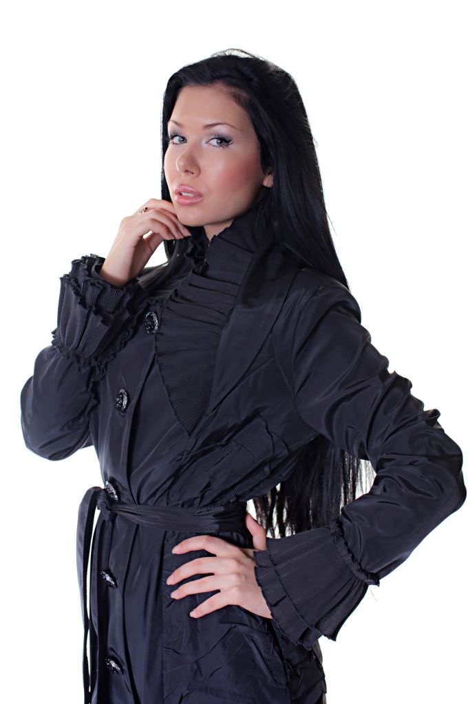 первое, что привлекает внимание - необычный покрйо лифа, выполненного в стиле многослойности и украшенного рюшами, благодаря чему ставится сексуальный и завораживающий акцент на зоне декольте. Вторят воротнику и рюши на манжетах, добавляющие образу мягкость и женственность. Силуэт плаща приталенный, прямой, чуть зауженный к низу, что визуально стройнит фигуру и в то же время сохраняет комфорт во время движения.