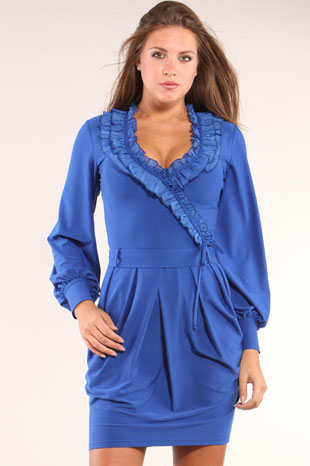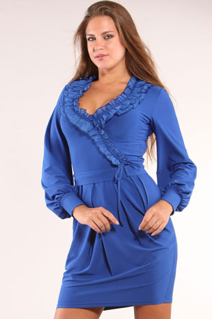 Нарядное синее платье, выполненное из тонкого трикотажа. Вырез горловины глубокий, V-образный. По краю горловина обработана широким двойным воланом, настроченным один на другой приспущенным до линии талии. Волан скреплен тонкой атласной тесьмой. Рукав длинный, свободный, втачной, по низу присобранный на манжет, который плотно облегает руку. По линии талии спереди на юбке заложены мягкие складки. Сзади юбка состоит из двух половинок со швом посередине. Длина модели – выше колен. По низу изделия проходит узкая отделочная строчка. Модель декорирована поясом, который завязывается сзади на бант.