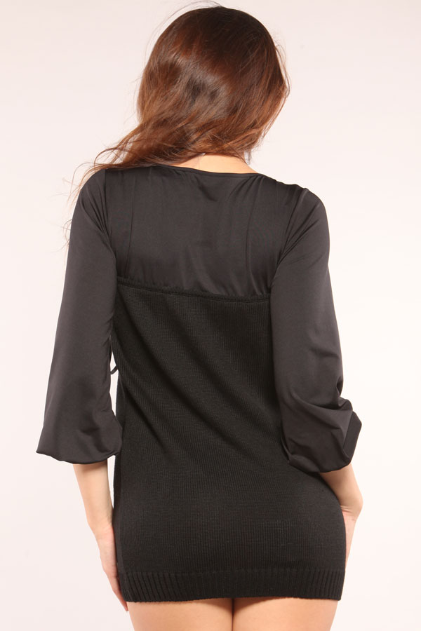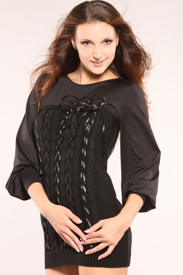 Нарядный комбинированный джемпер черного цвета с лентами. Верхняя часть модели выполнена из тонкого трикотажного полотна. Вырез горловины «лодочкой», отстрочен узкой отделочной строчкой. Из этой же ткани выполнены рукава. Рукава длинные, свободные, втачные, внизу присобранные на широкий манжет. Центральная часть изделия выполнена из вязаного плотного полотна с продольным узором. Узор выполнен в виде переплетающихся косичек. Декорирован узор втянутыми и переплетающимися лентами из атласа и шифона. По низу модель заканчивается широким поясом, выполненным в виде резинки.