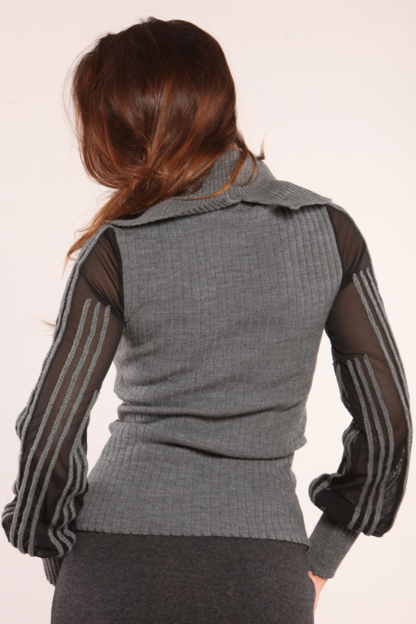 Отличительной особенностью этой модели является фасон. Рукава длинные, выполнены из прозрачного шифона, украшены вертикальными полосками из более плотной серой ткани. У основания – широкие манжеты.