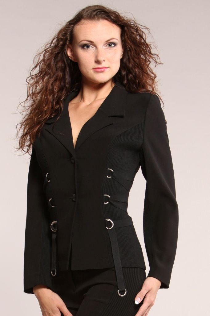 Рукава прямые, длинные. Пиджак застёгивается на две небольшие пуговицы. Воротник угловой, прямой. В области талии, по бокам имеются металлические кольца, сквозь которые пронизаны атласные тонкие ленты.