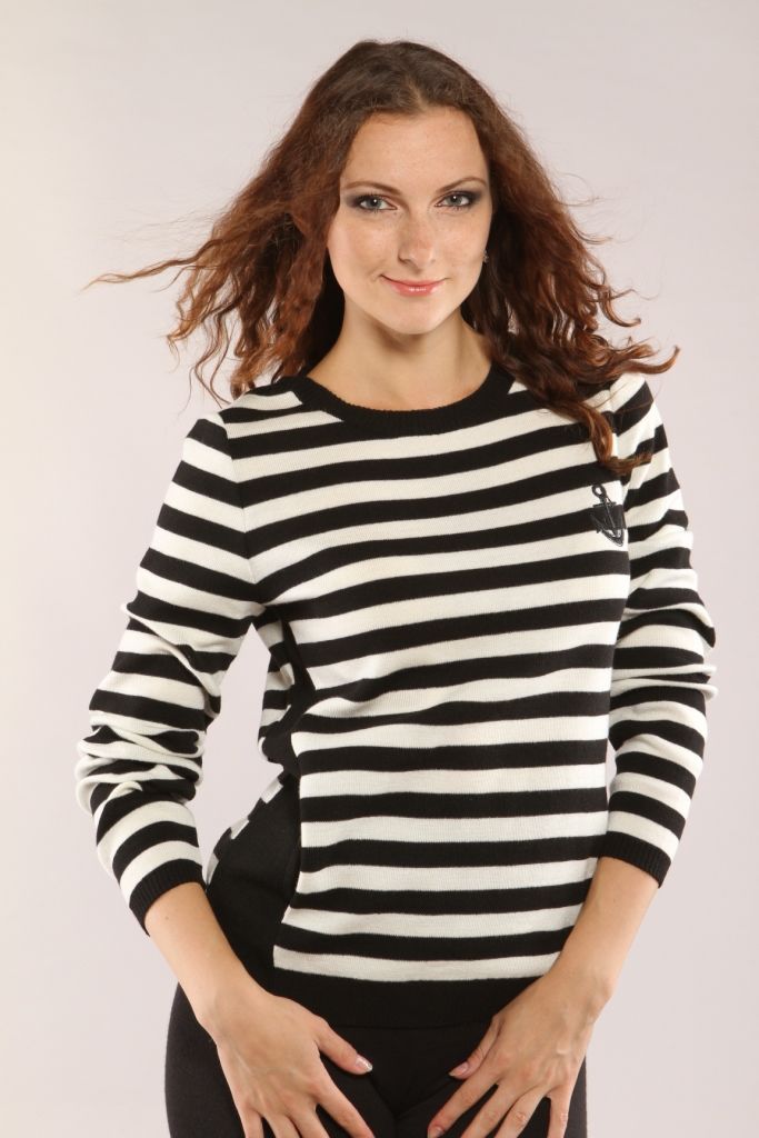 Легкий джемпер, выполненный из черно-белого полотна в полоску. По боковым швам от линии проймы до низа встрочена черная клинообразная вставка. Вырез горловины круглый, обработанный широкой черной полосой. Рукав длинный, втачной. По нижнему краю посаженый на узкую резинку. На полочке с левой стороны в районе груди расположен небольшой рисунок в виде якоря. По спинке вырез горловины круглый, углубленный. По вырезу в шахматном порядке настрочены широкие полосы из черного вязаного полотна. Длина изделия – до бедра.