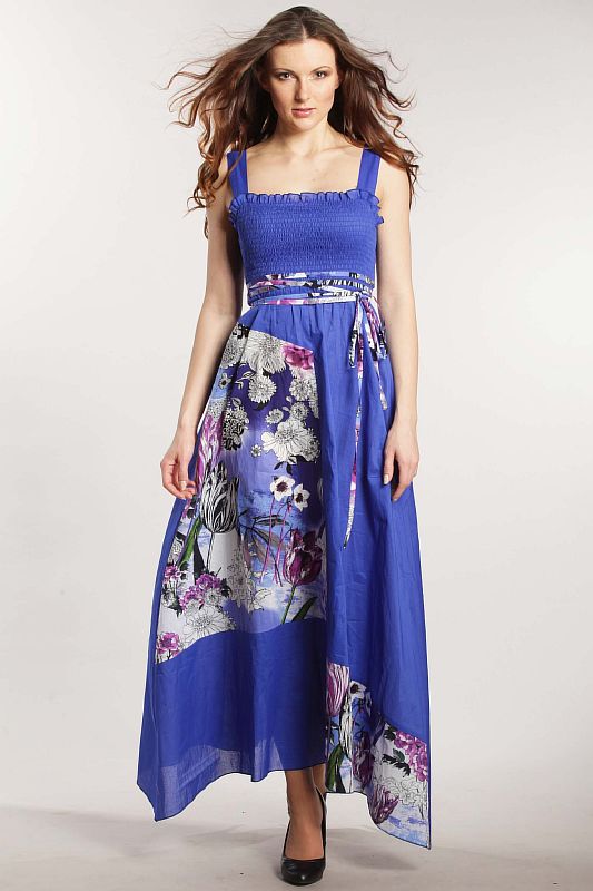 Легкий летний сарафан с ярким цветочным принтом. Модель выполнена из хлопчатобумажной ткани. Полочка цельнокроеная, жатая и посаженная на узкую резинку, которая проходит горизонтально по всей площади полочки. По верхнему краю обработана рюшем. Юбка свободная, из четырех полотнищ, покроенная широкими клиньями, которые расширяются к низу, и свисают по бокам. Клинья дополнены горизонтальными подрезаим. Линия талии завышена. По линии талии несколько раз обернут и завязан узкий цветастый поясок. Верх платья посажен на широкие бретельки. Длина модели – до щиколоток.